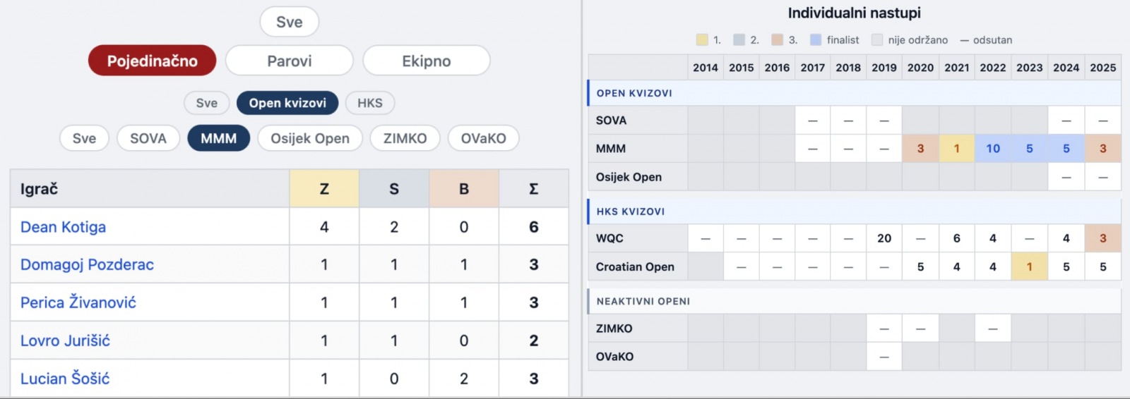 Jeste li se ikada zapitali koji ste točno bili na pojedinačnom kvizu na Memorijalu prije pet godina, ili tko je sve uzeo medalje na EDP-u dok se scena tek zahuktavala, a vi ste još išli u osnovnu školu? U slučaju potvrdnog odgovora na neko od ovih pitanja, imate sreće - Neven Trgovec je to prikupio na jednom mjestu, koje obuhvaća sve vikend-opene diljem Hrvatske i sva HKS-ova državna prvenstva u posljednjih više od 10 godina.